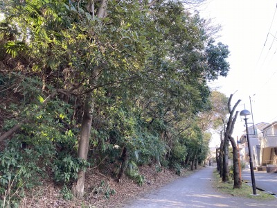 習志野市役所方面から城址公園へ向かう道。左が城址公園。古墳や城は台地に築かれたことがよく分かる。