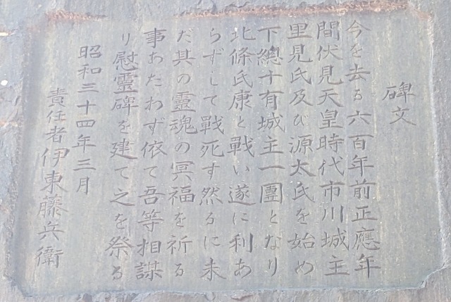 今を去る六百年前正應年間伏見天皇時代市川城主里見氏及び源太氏を始め下總十有城主一團となり北条氏康と戦い遂に利あらずして戦死す